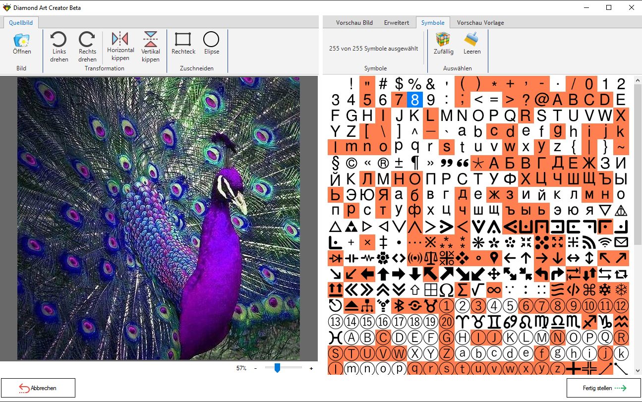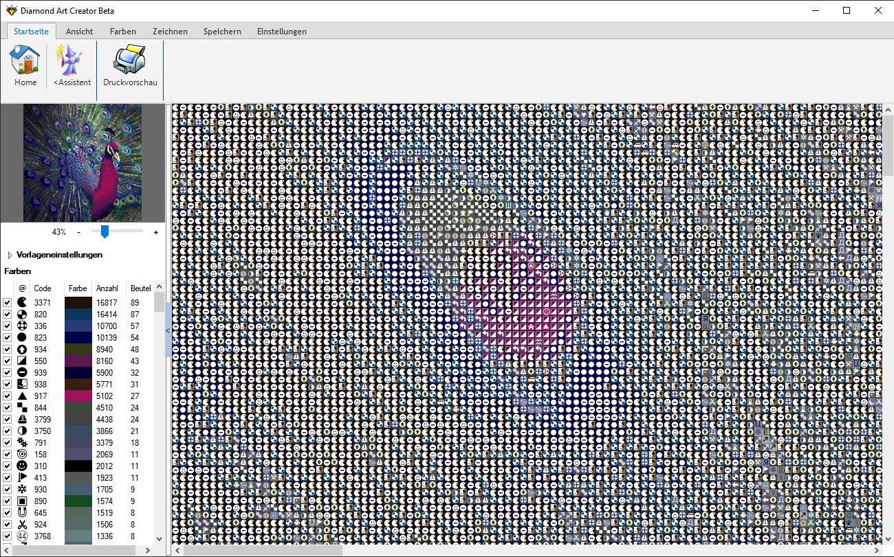 Es ist schon mit nur 4 Mausklicks möglich, eine fertige Vorlage zu erstellen. Diamond Art Creator nutzt Standardvorgaben, die aus bereits erstellten Vorlagen übernommen werden können. Zusätzlich können Sie die Größe der Vorlage, die