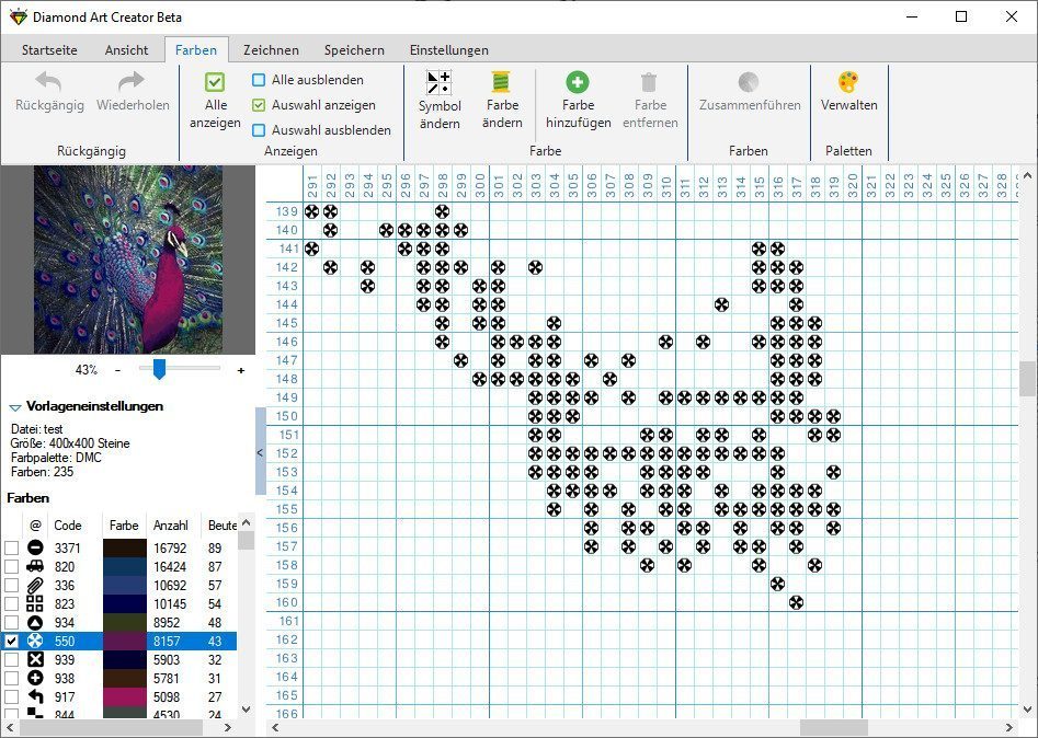 Sobald die Vorlage erstellt wurde, kann sie mit dem einfachen Editor leicht bearbeitet werden. Sie können einzelne Felder oder ganze Bereiche farblich anpassen und auch nur bestimmte Farben anzeigen lassen, um ihre Verwendung in der Vorlage schnell zu identifizieren. Außerdem können Sie Farben neue Symbole zuweisen. Es können auch neue Farben hinzugefügt werden. Alle Änderungen lassen sich jederzeit in beliebig vielen Schritten rückgängig machen oder wiederherstellen.
